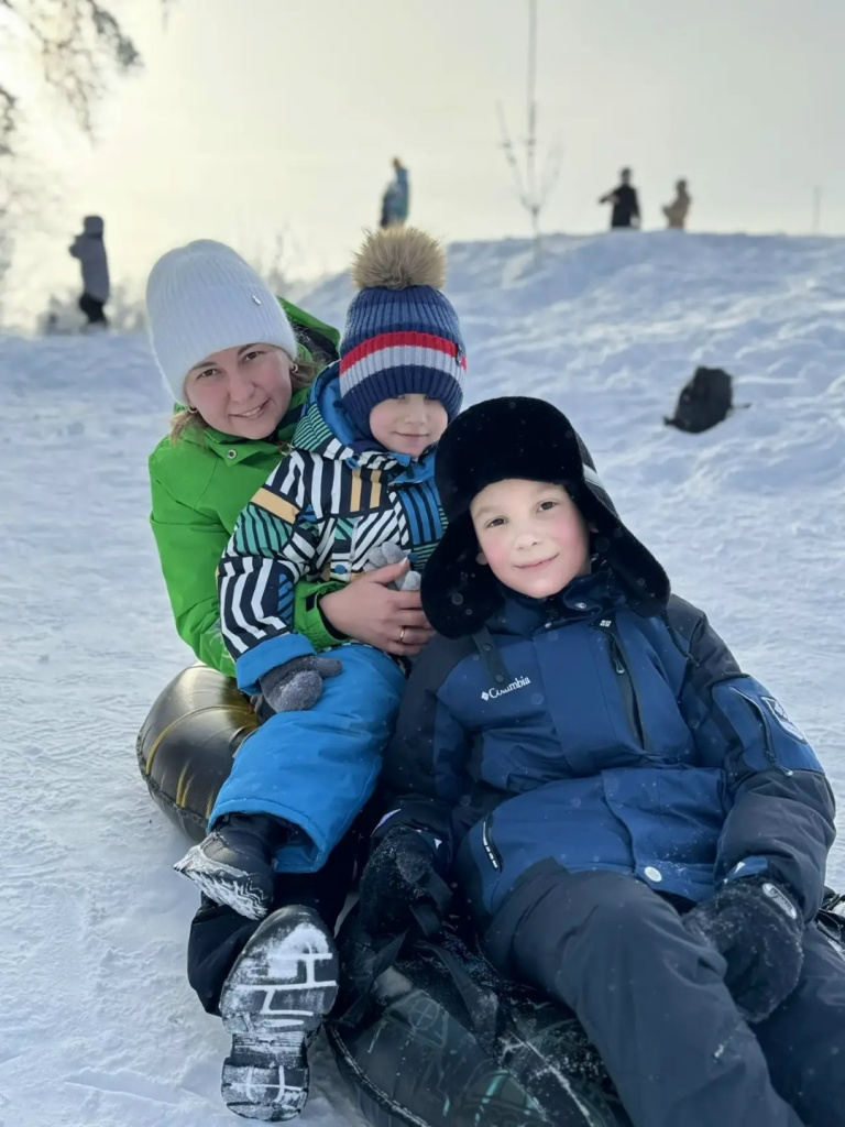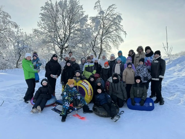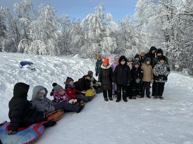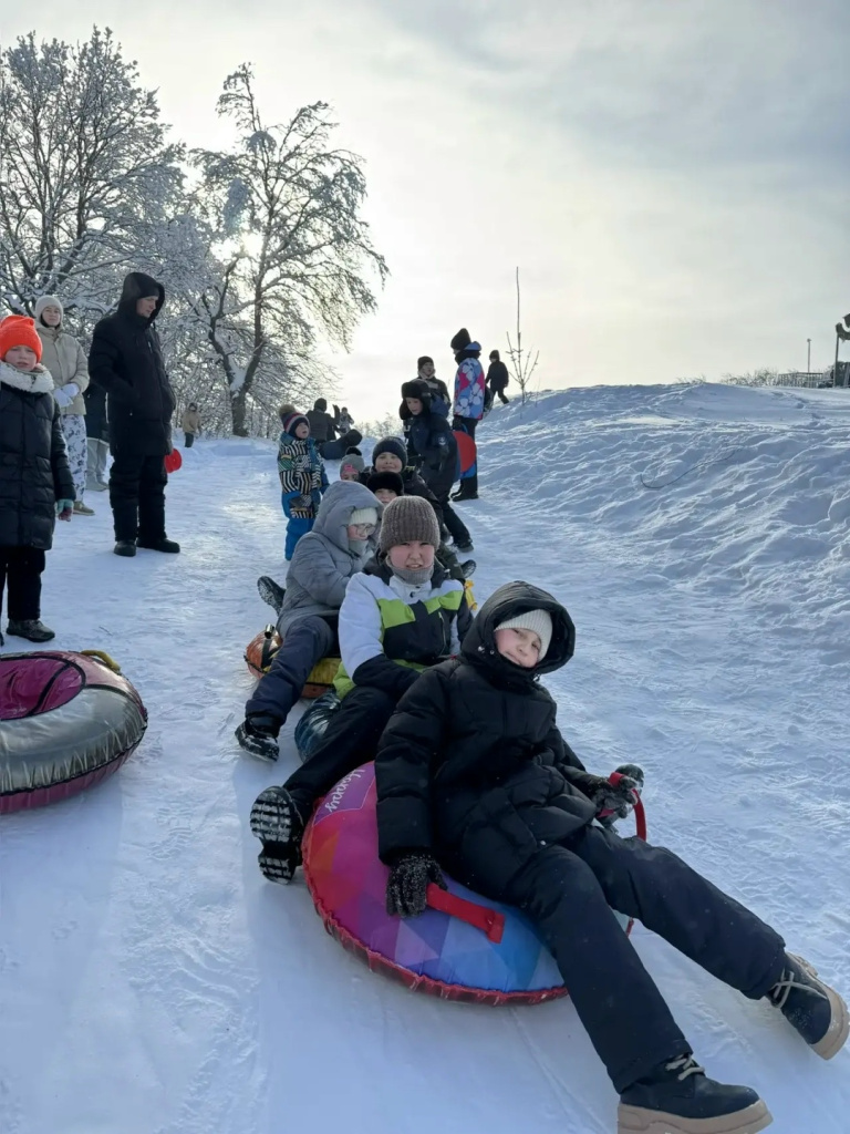 Ребята поднимаются на горку, смеются, поправляют ватрушки и ледянки. Сверху открывается вид на тихий лес: ветви деревьев искрятся на солнце, а снег хрустит под ногами. И вот — разгон, быстрый спуск вниз, ветер свистит в ушах, а сердце наполняется радостью и восторгом.